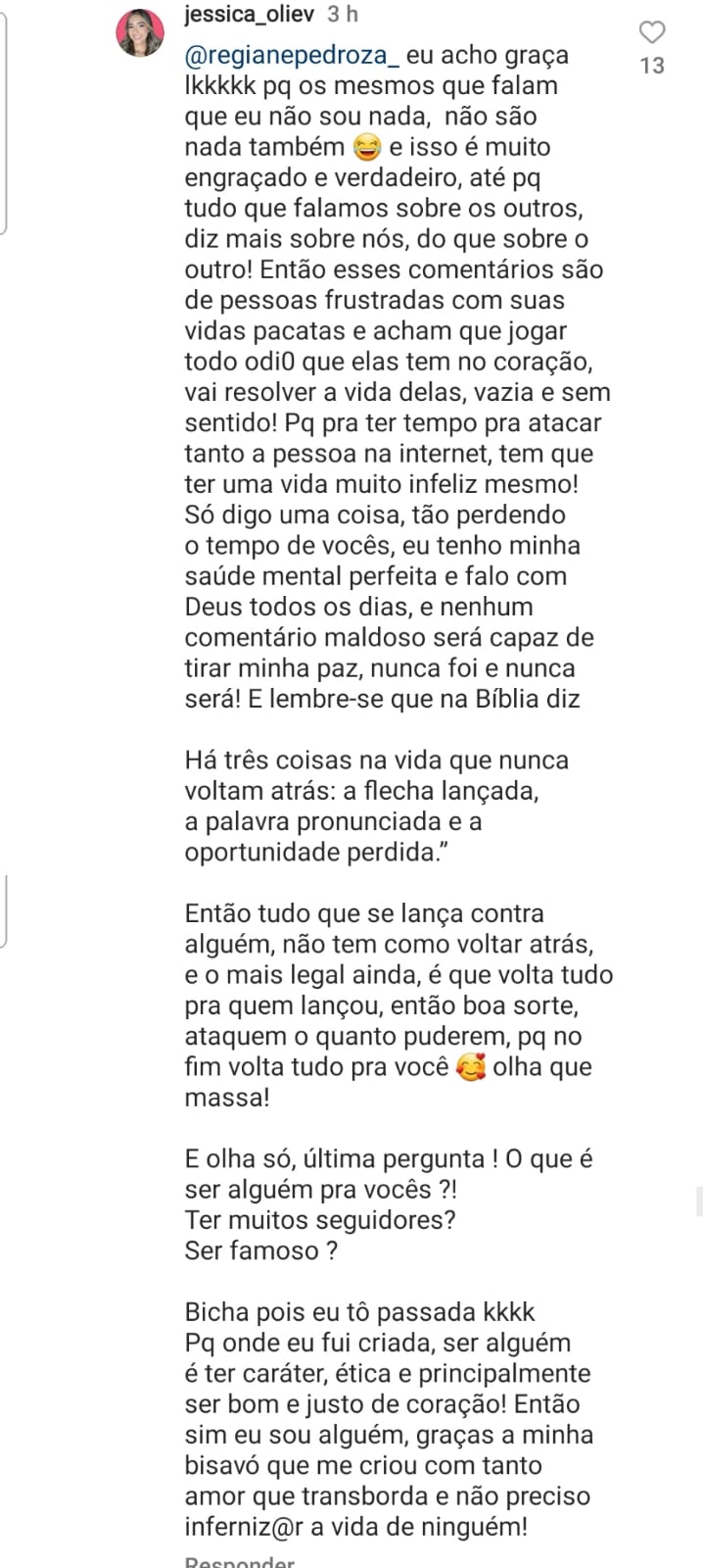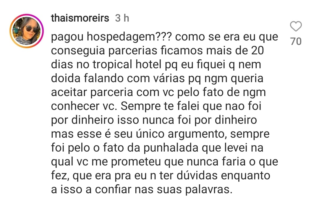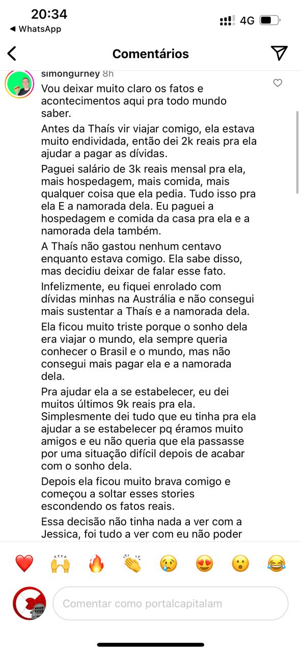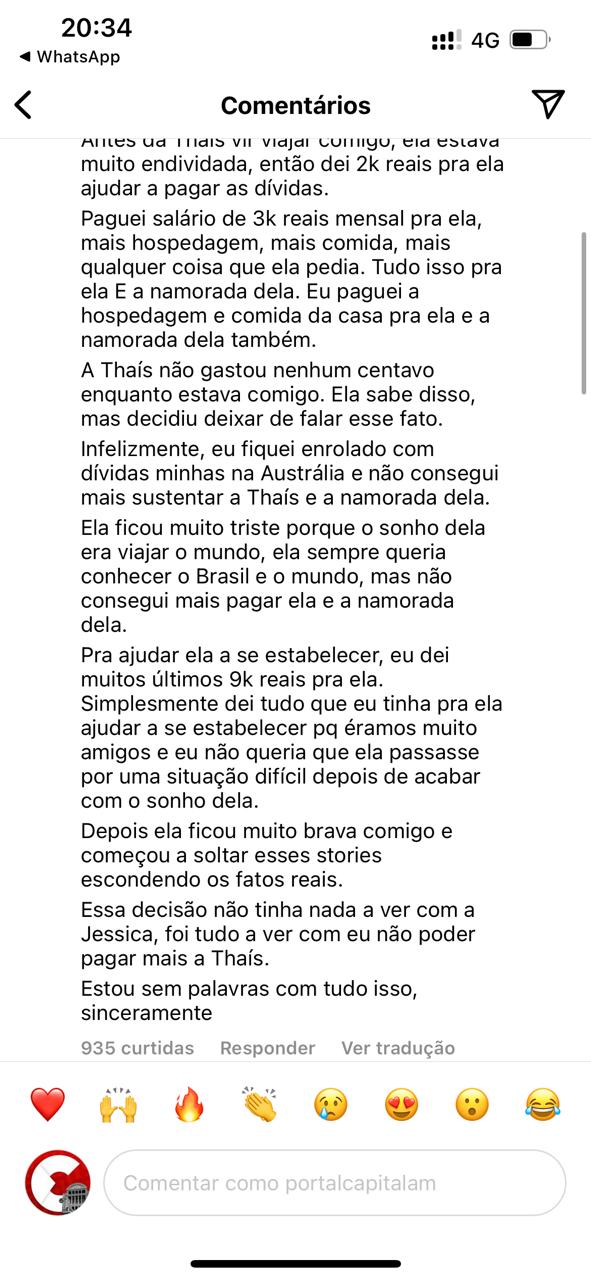 “Vou deixar muito claro os fatos e acontecimentos aqui pra todo mundo saber. Antes da Thaís vir viajar comigo, ela estava muito endividada, então dei 2k reais pra ela ajudar a pagar as dívidas. Paguei salário de 3k reais mensal pra ela, mais hospedagem, mais comida, mais qualquer coisa que ela pedia. Tudo isso pra ela E a namorada dela. Eu paguei a hospedagem e comida da casa pra ela e a namorada dela também. A Thaís não gastou nenhum centavo enquanto estava comigo. Ela sabe disso, mas decidiu deixar de falar esse fato. Infelizmente, eu fiquei enrolado com dívidas minhas na Austrália e não consegui mais sustentar a Thaís e a namorada dela. Ela ficou muito triste porque o sonho dela era viajar o mundo, ela sempre queria conhecer o Brasil e o mundo, mas não consegui mais pagar ela e a namorada dela. Pra ajudar ela a se estabelecer, eu dei muitos últimos 9k reais pra ela. Simplesmente dei tudo que eu tinha pra ela ajudar a se estabelecer pq éramos muito amigos e eu não queria que ela passasse por uma situação difícil depois de acabar com o sonho dela. Depois ela ficou muito brava comigo e começou a soltar esses stories escondendo os fatos reais. Essa decisão não tinha nada a ver com a Jessica, foi tudo a ver com eu não poder pagar mais a Thaís. Estou sem palavras com tudo isso, sinceramente”, publicou o gringo.