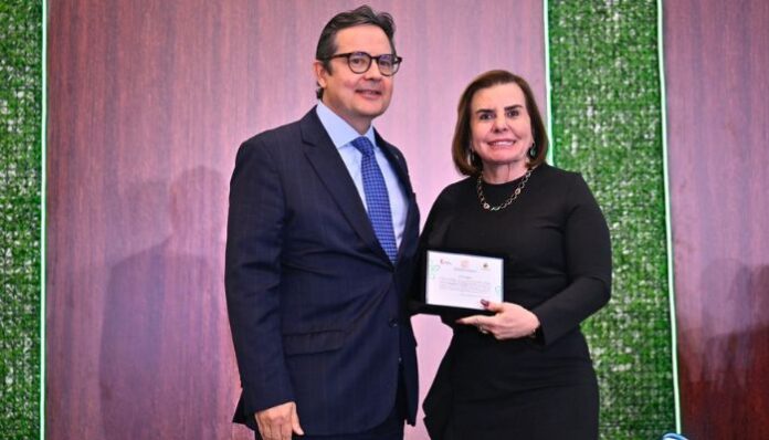 Durante a cerimônia de abertura do IX Congresso Internacional de Controle e Políticas Públicas, realizada na noite desta segunda-feira (27), a conselheira-presidente do Tribunal de Contas do Amazonas (TCE-AM), Yara Amazônia Lins, foi homenageada por sua liderança e atuação decisiva na organização do evento. O coordenador-geral da Escola de Contas, conselheiro Júlio Pinheiro, também foi homenageado. Duas placas foram entregues pelo presidente do Instituto Rui Barbosa (IRB), conselheiro Edilberto Pontes, em reconhecimento ao empenho e profissionalismo da conselheira e de toda a equipe da Corte de Contas amazonense.