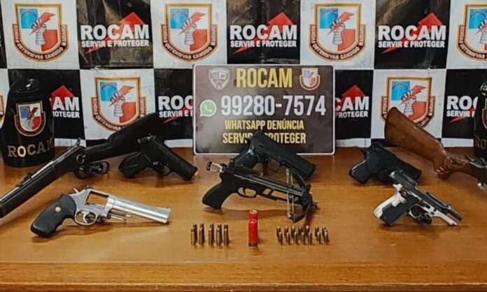 No local, os policiais encontraram a vítima e realizaram buscas no imóvel. Durante a vistoria, foram apreendidos um revólver calibre 38, uma pistola calibre 380, um rifle calibre 38 e uma espingarda calibre 16, além de três simulacros de arma de fogo.