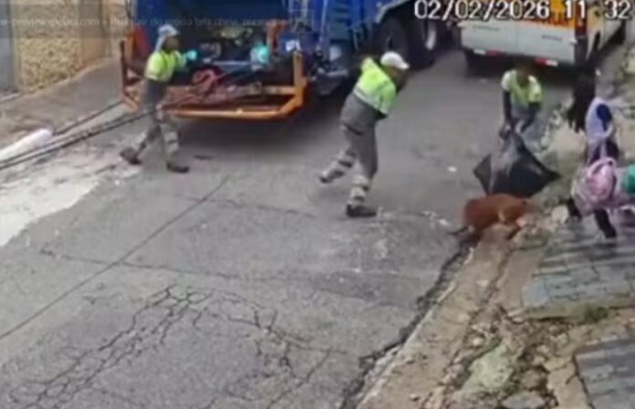 As imagens mostram o momento em que os coletores realizavam o serviço quando o animal saiu de uma casa e avançou contra os funcionários. Sem conseguir escapar, eles tentaram se defender usando ferramentas de trabalho, como pás, além de sacos de lixo.