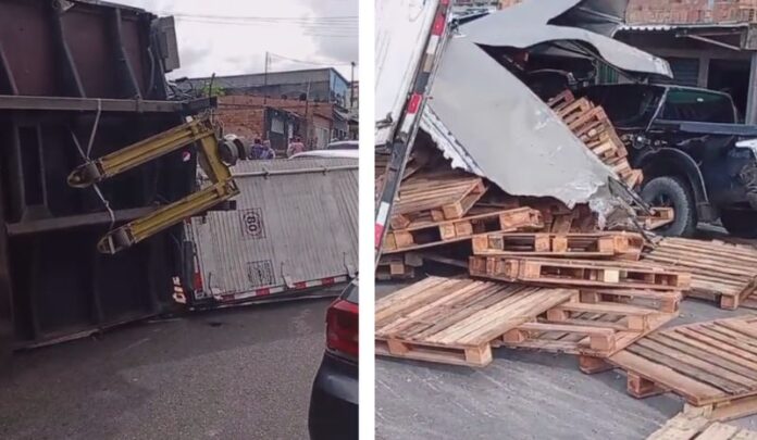 Na tarde desta quinta-feira (5), um caminhão que transportava pallets tombou na rua Hibisco, conhecida como “Pista da Raquete”, no bairro Nova Vitória, zona leste de Manaus, espalhando parte da carga e causando transtornos no trânsito.