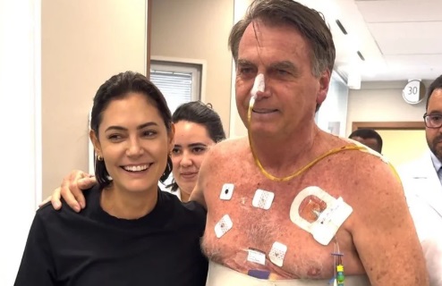 Michelle posta foto com Bolsonaro no hospital: “Seguirei cuidando”
