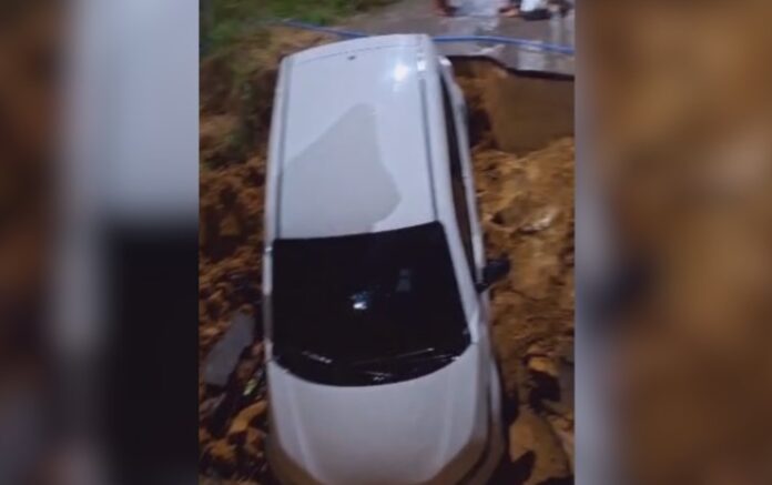 Uma das rodas dianteiras ficou presa no buraco, causando danos na suspensão e na parte inferior do carro.