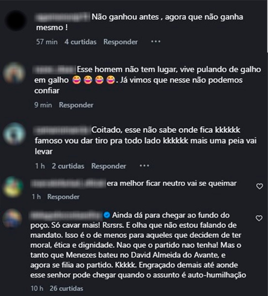 Nas redes sociais, a reação foi imediata. “Esse homem não tem lugar, vive pulando de galho em galho”, escreveu um internauta. Em outra publicação, a desconfiança se repete: “Já vimos que nesse não podemos confiar”. Há ainda quem ironize o desempenho eleitoral: “Esse Menezes já virou candidato folclórico” e “Não ganhou antes, agora que não ganha mesmo”.