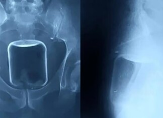 Em Nizhny Novgorod, Rússia, um homem não identificado passou por uma cirurgia de alto risco para remover um copo de vidro de seu intestino,...